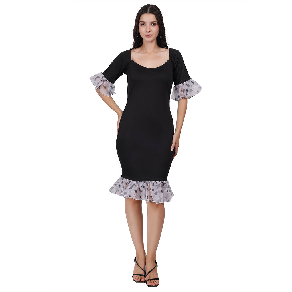 Step into confidence with this sleek black bodycon dress, designed to hug your curves and enhance your silhouette. Made from a soft, stretchable fabric, it ensures a comfortable yet figure-flattering fit. Whether it's a night out, a dinner date, or a party, this dress is your go-to for effortless elegance.