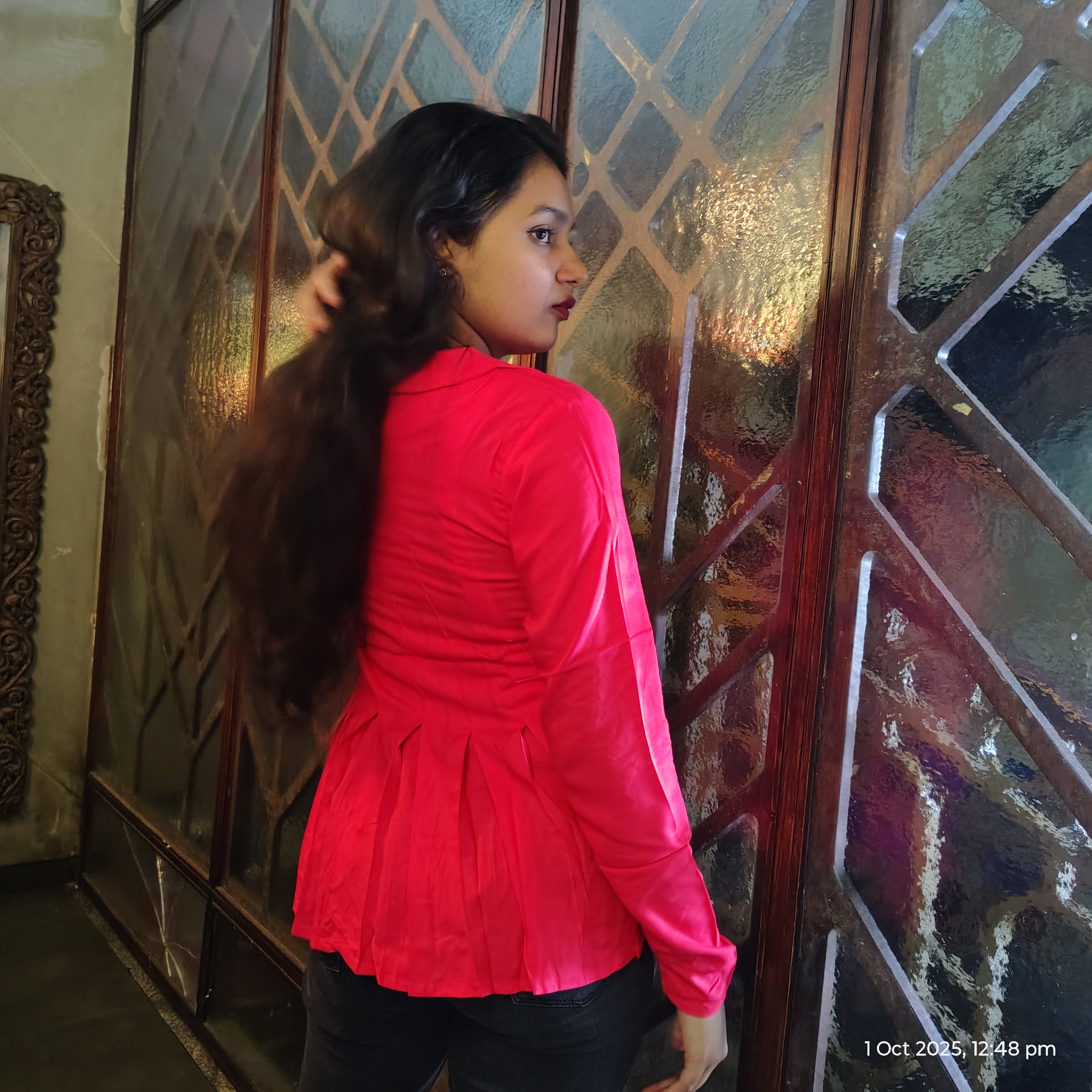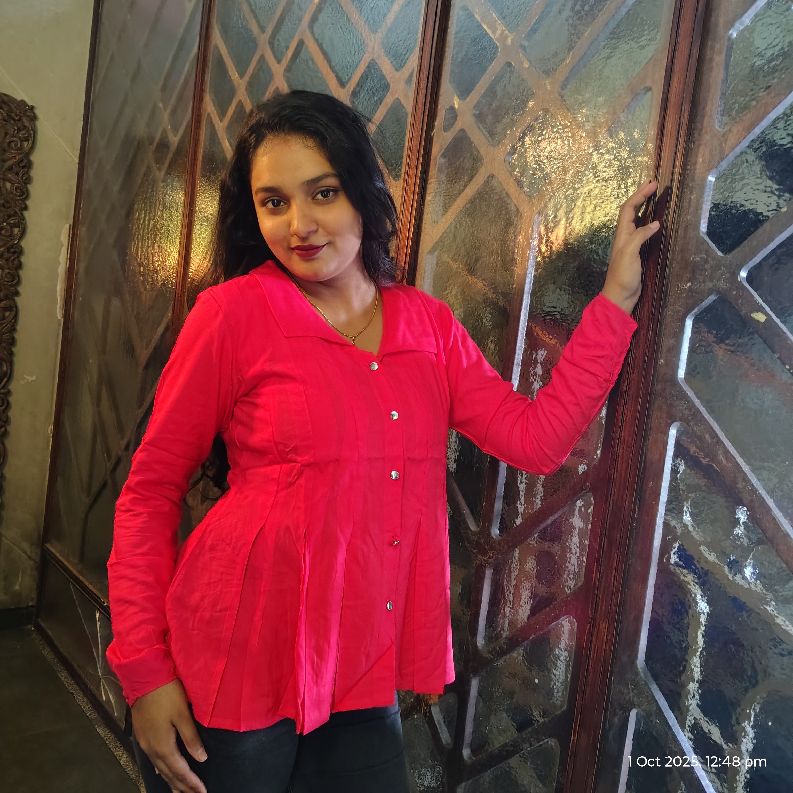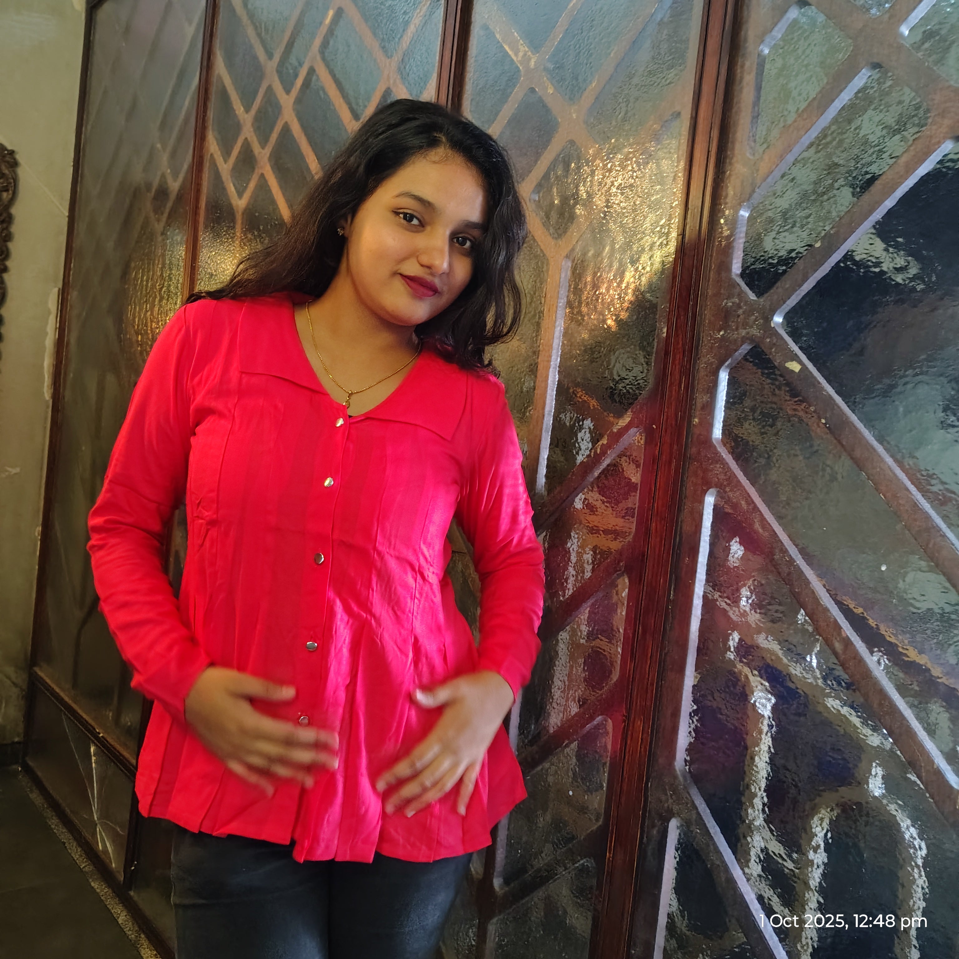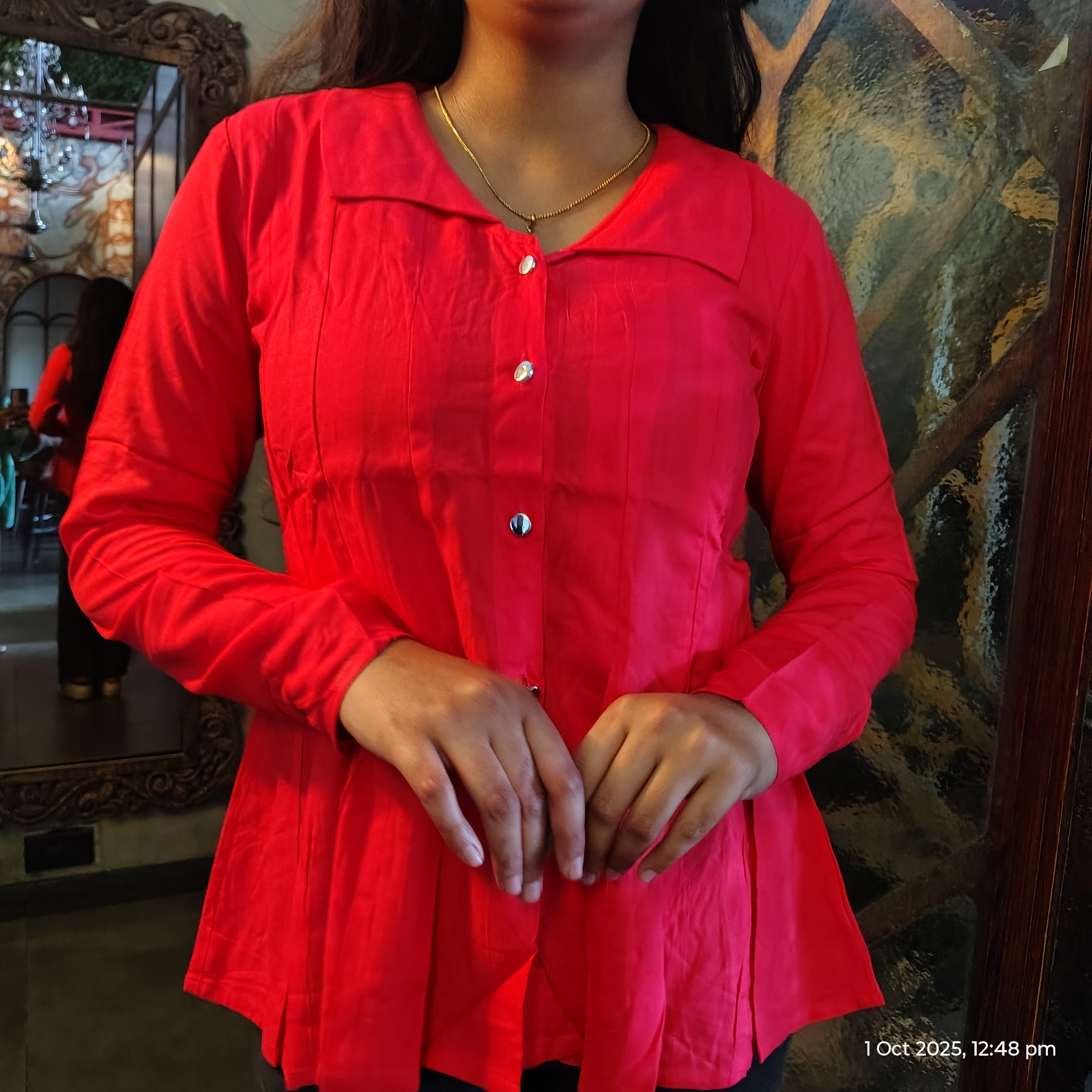 The design of the Redtop features a classic yet modern silhouette that flatters every body shape. With a tailored fit, it accentuates the natural curves while providing a relaxed, flattering look. Its straight-cut shape ensures that it drapes elegantly on your body, creating a smooth, slimming effect. The slightly fitted waist gives it a structured look that pairs perfectly with your favorite jeans, giving you a timeless, effortless style. The top is designed to offer ample comfort, ensuring it doesn't feel too tight or too loose, but just right for all-day wear.